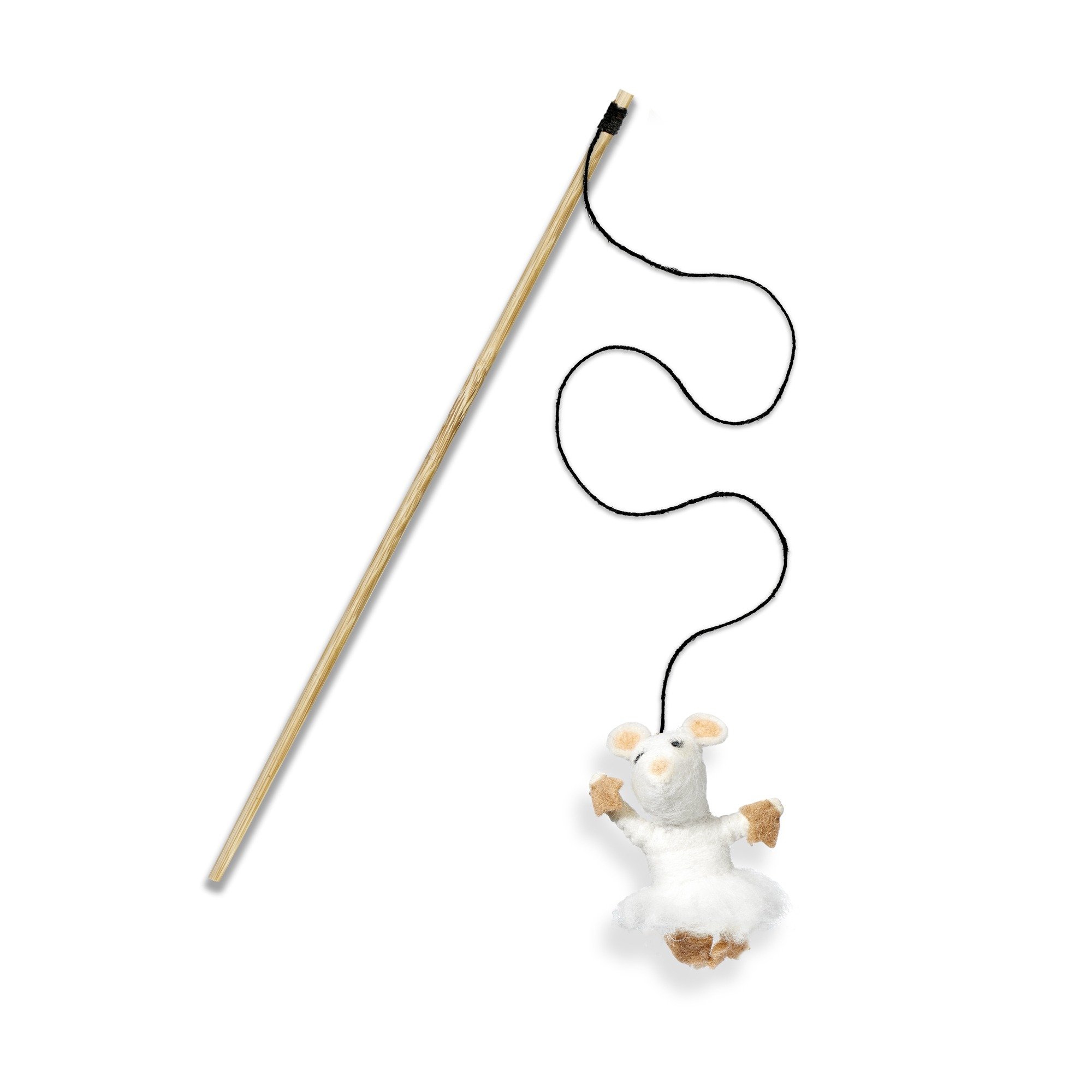 Made with sustainable and natural materials; wool felt, jute string, and a bamboo wood stick. Produced without using any added compound that would harm or be released when chewed.