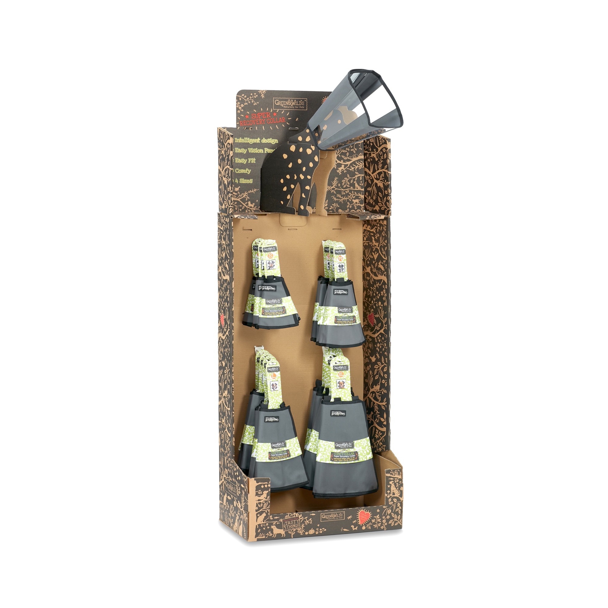 Our NEW recycled cardboard stand has been custom designed to display the entire range of Comfy Recovery Collars and comes complete with "Dotty the Dog", who slots into the top and is the perfect model!
