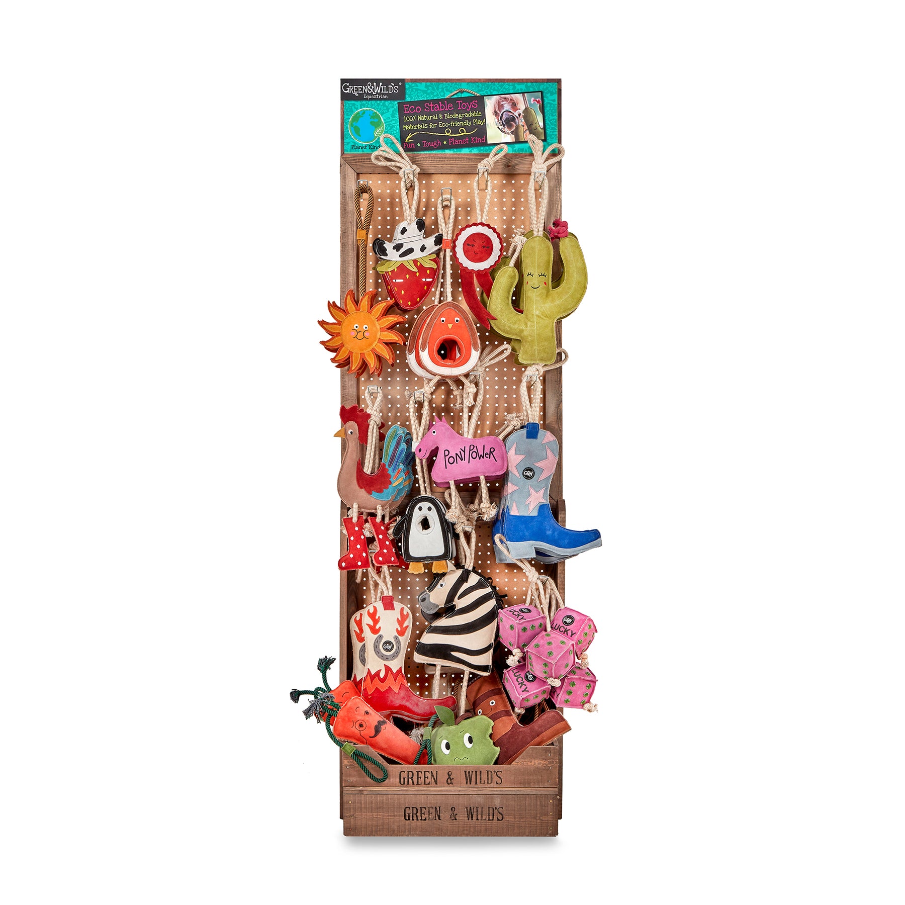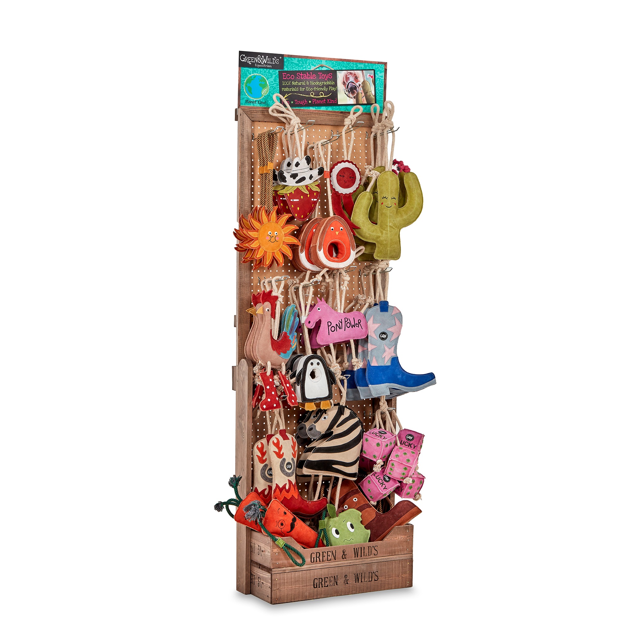Supplied with a selection of our Eco Horse Toys. Stock may vary from the image shown as the fill is updated to reflect new products and best-selling lines. For a current list of all the products included, please email contact@greenandwilds.co.uk