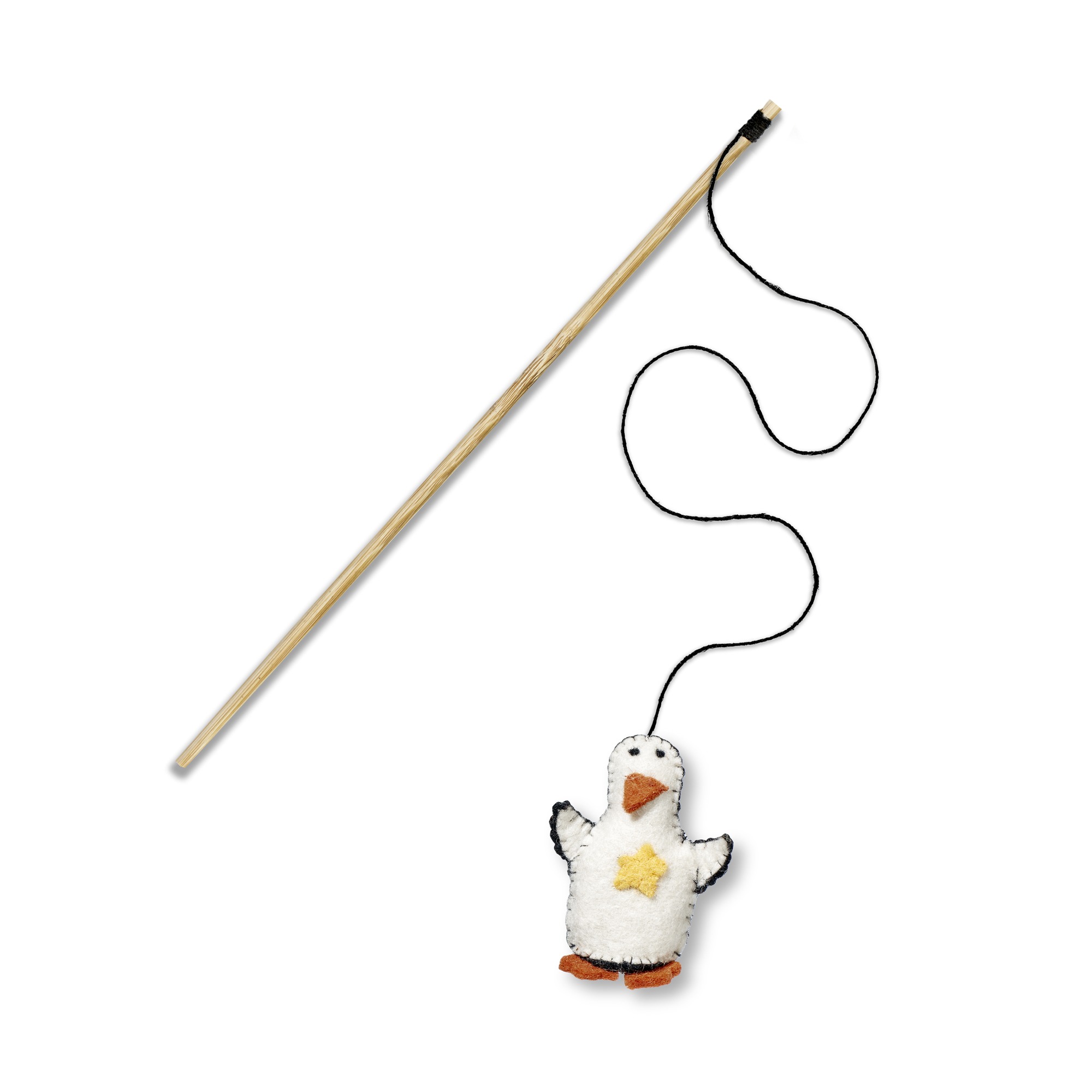 Made with sustainable and natural materials; wool felt, jute string, and a bamboo wood stick. Produced without using any added compound that would harm or be released when chewed.