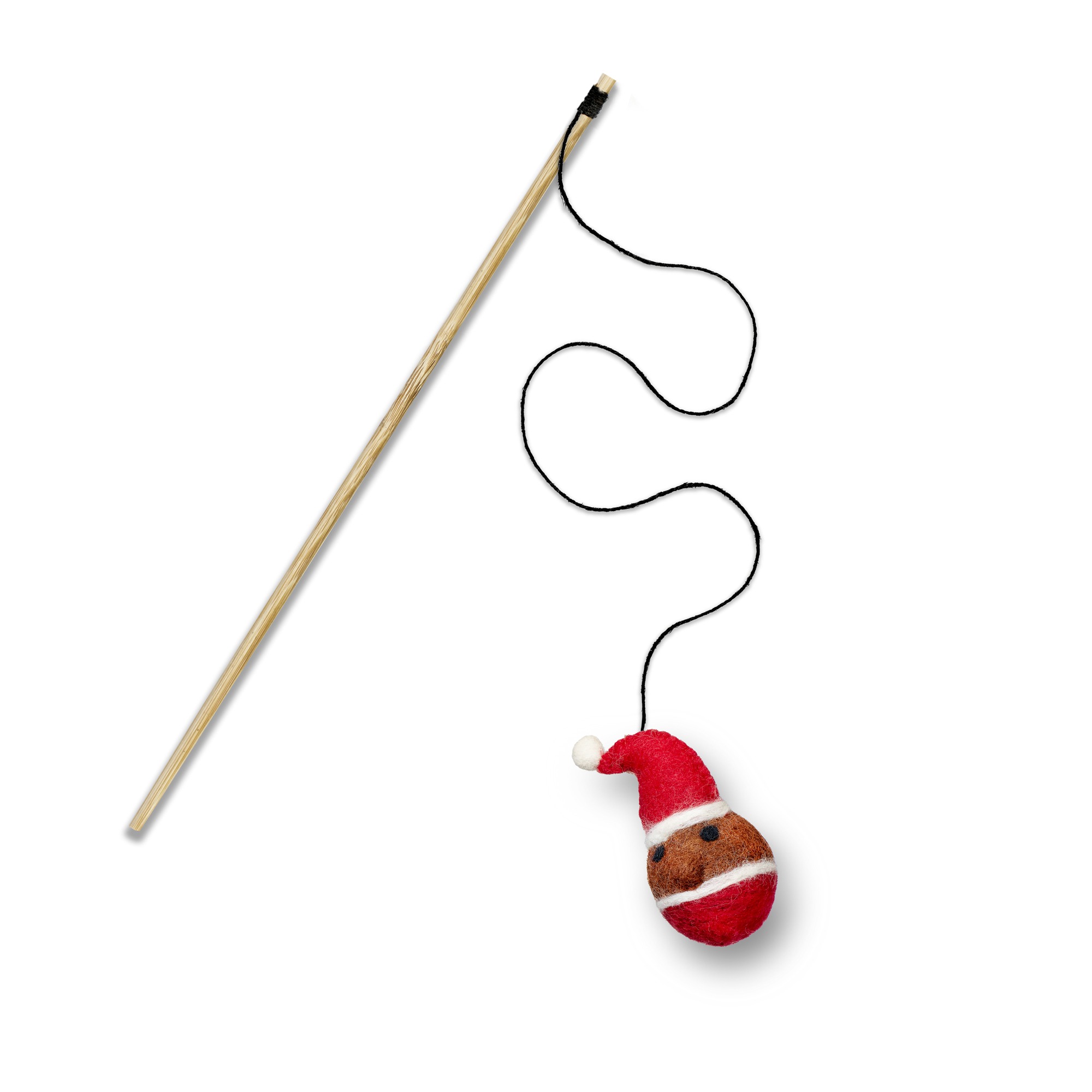 Made with sustainable and natural materials; wool felt, jute string, and a bamboo wood stick. Produced without using any added compound that would harm or be released when chewed.