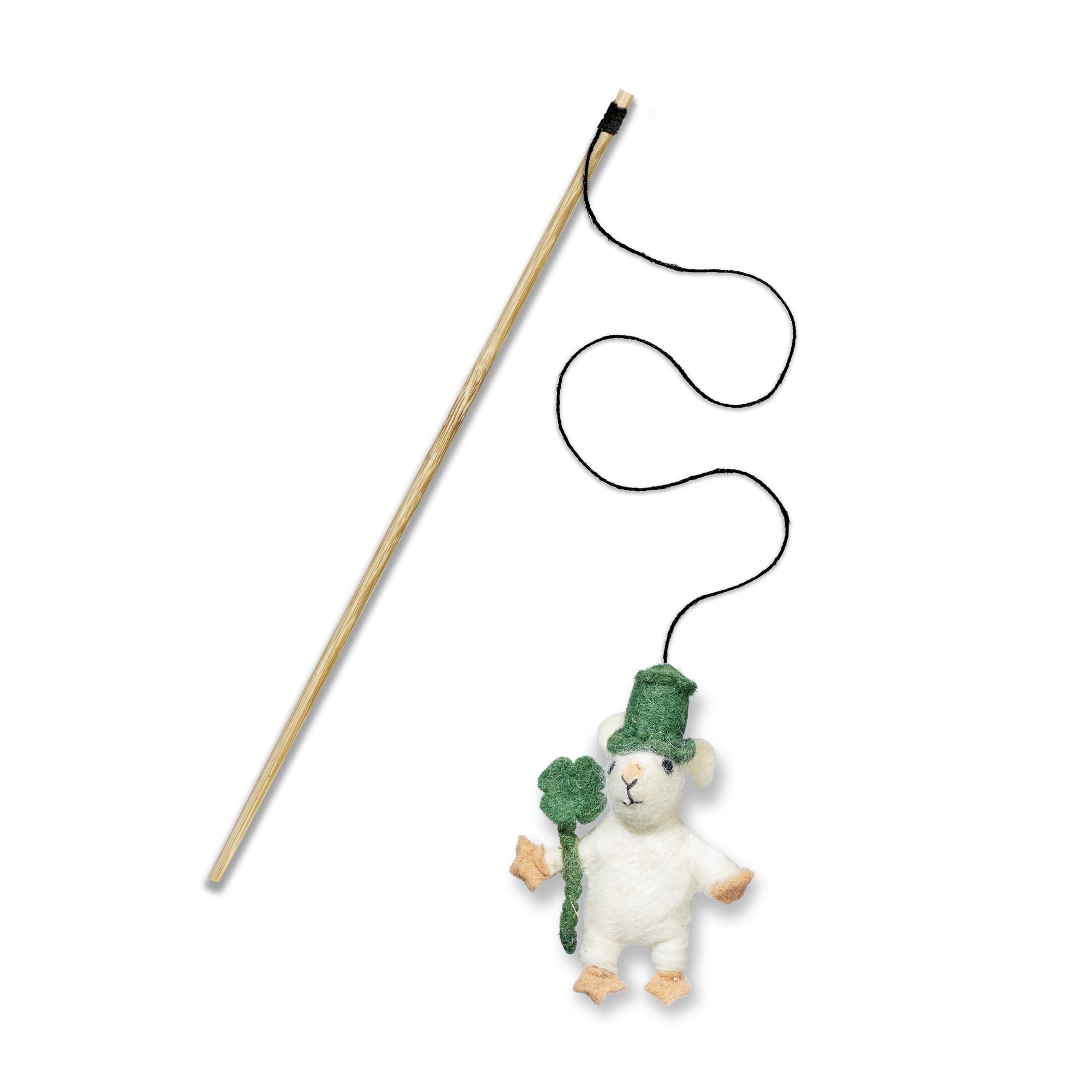Made with sustainable and natural materials; wool felt, jute string, and a bamboo wood stick. Produced without using any added compound that would harm or be released when chewed.