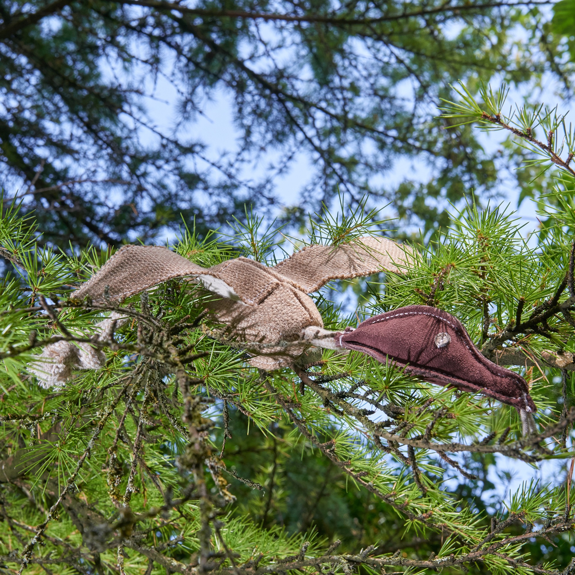 Desmond the Duck is made from four layers of jute fabric, twin-stitched over recycled cotton and jute rope. His head is soft suede, filled with natural fibres.