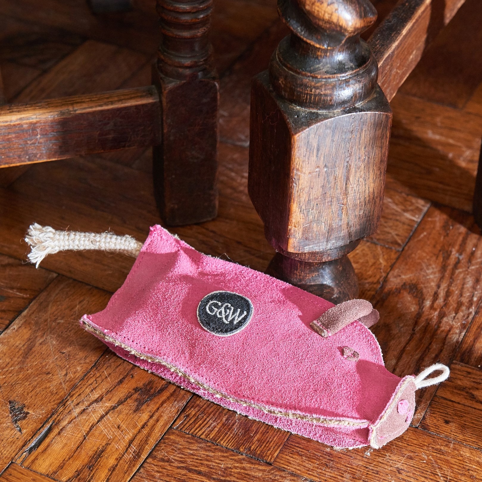Peggy the Pig is made from soft suede, stitched over recycled cotton and a recycled bottle to add that "CRUNCH" when playing. A jute rope tail adds extra interest. She even has a hook and loop fastener on her behind (ooh er missus!) so you can replace the crinkler bottle or add tasty treats to really get some interest. A toy (and a friend) for you and your dog. A great toy for throwing, dogs can have hours of fun with Peggy.