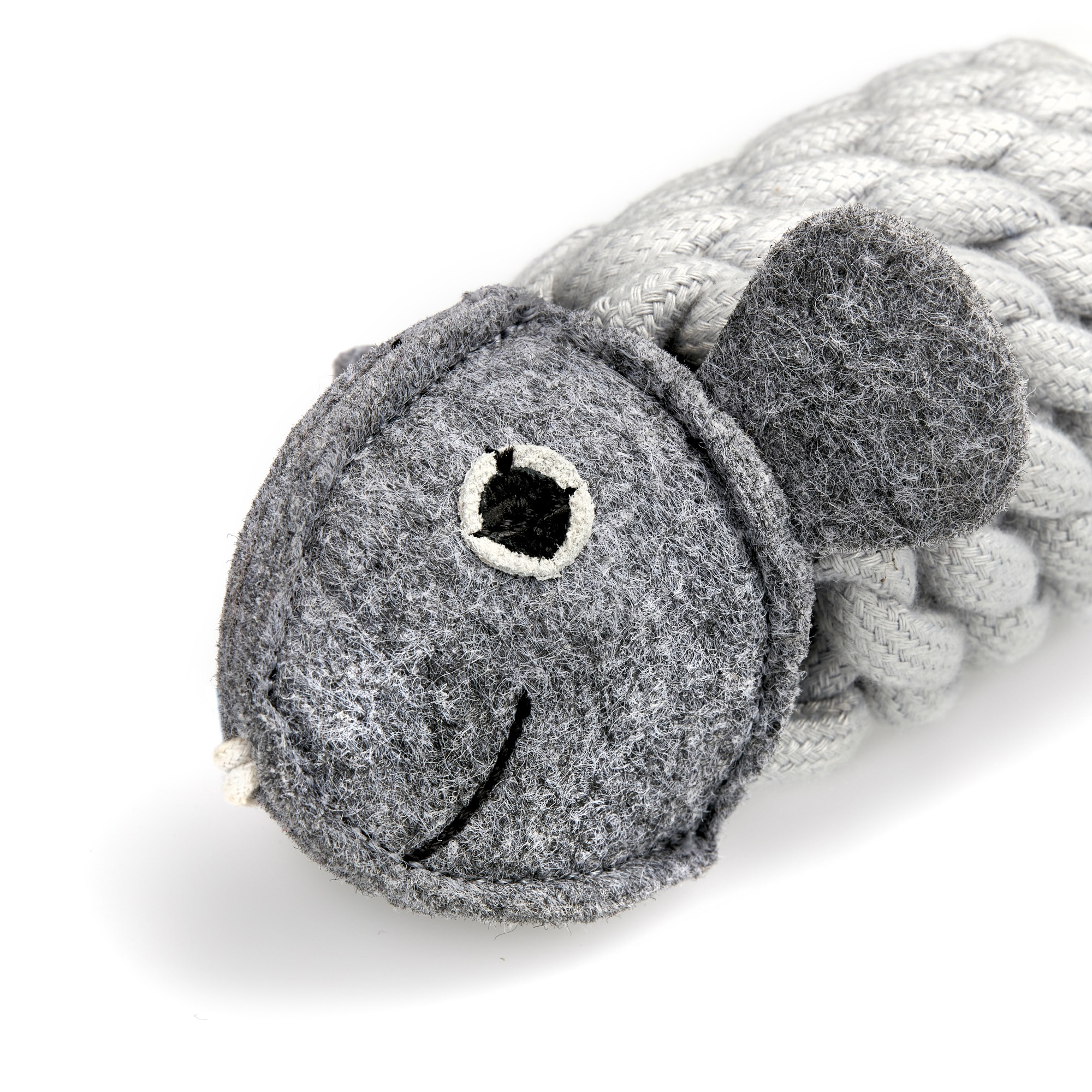 In different shades of muted grey, he is composed from a felt head and tail with a recycled plastic bottle covered in braided jute rope. Jute is a natural, sustainable plant fibre. The suede used for his eye is a by-product and ensures that this material is not wasted. Tough and long lasting, made without using any compound that would harm or be released when chewed. Jute is 100% biodegradable.