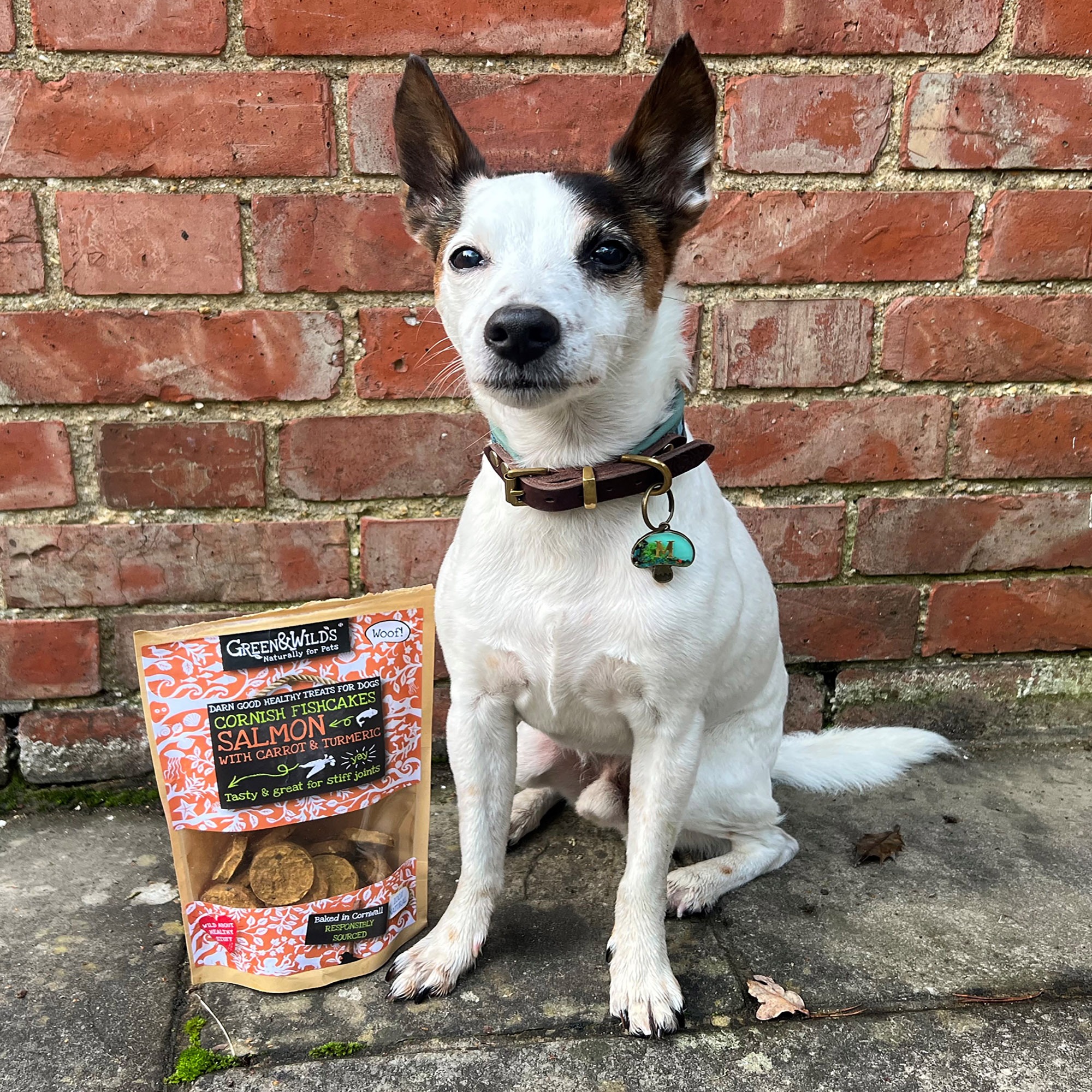 Baked in Cornwall, our tasty Salmon, Carrot & Turmeric Fishcakes are a great snack for any dog.