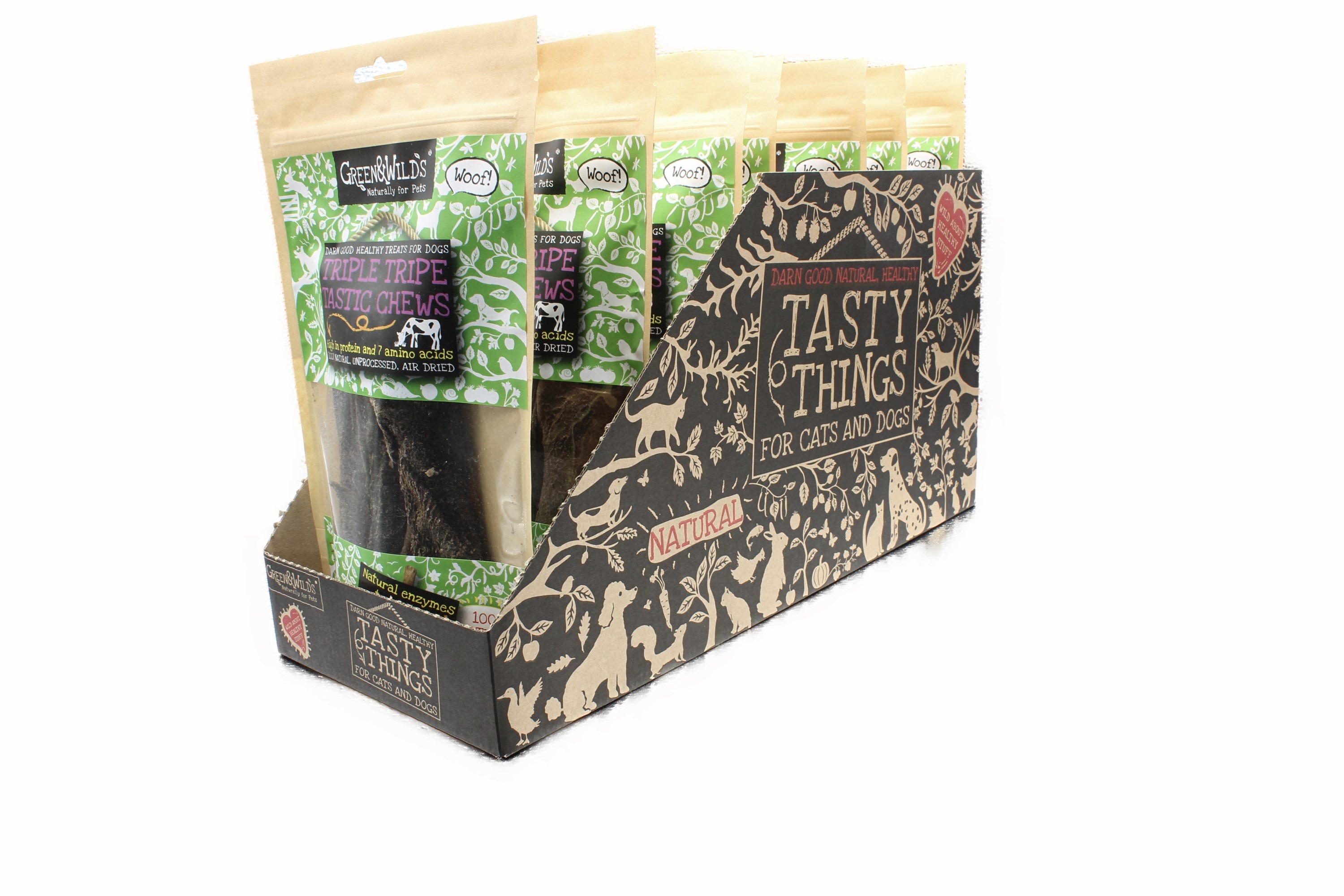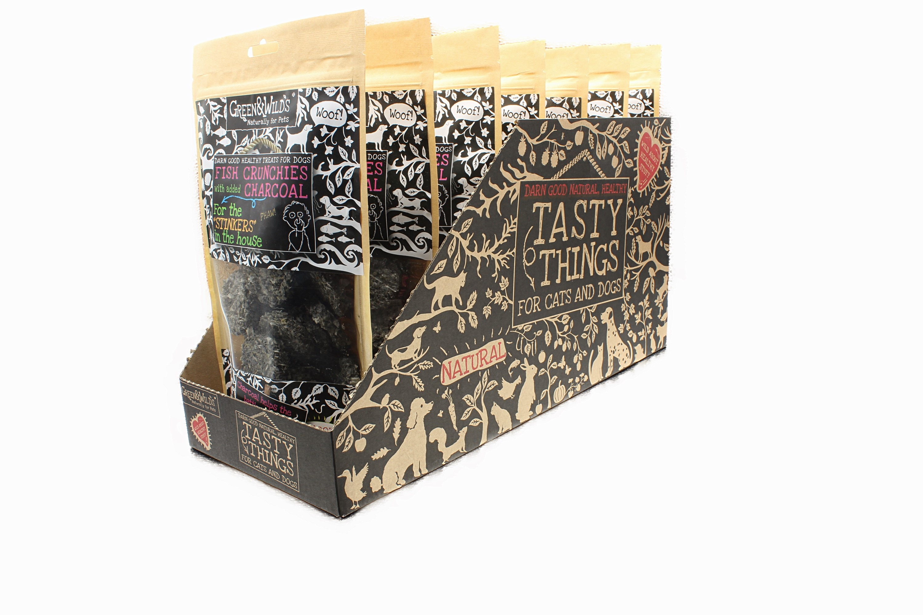 Our new style carboard shelf ready boxes are great for displaying Green & Wild's treat bags on shelves.