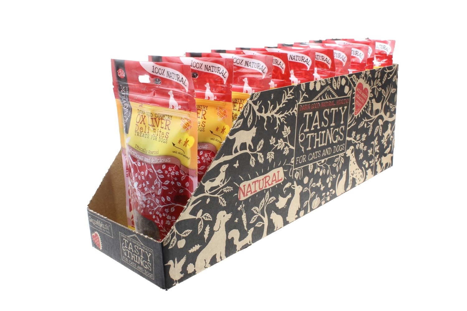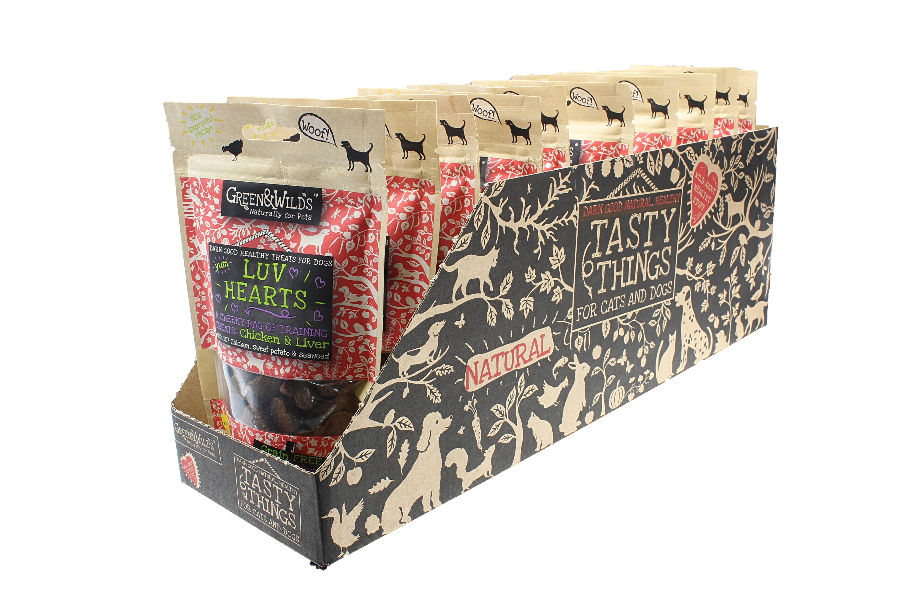Our new style carboard shelf ready boxes are great for displaying Green & Wild's treat bags on shelves.